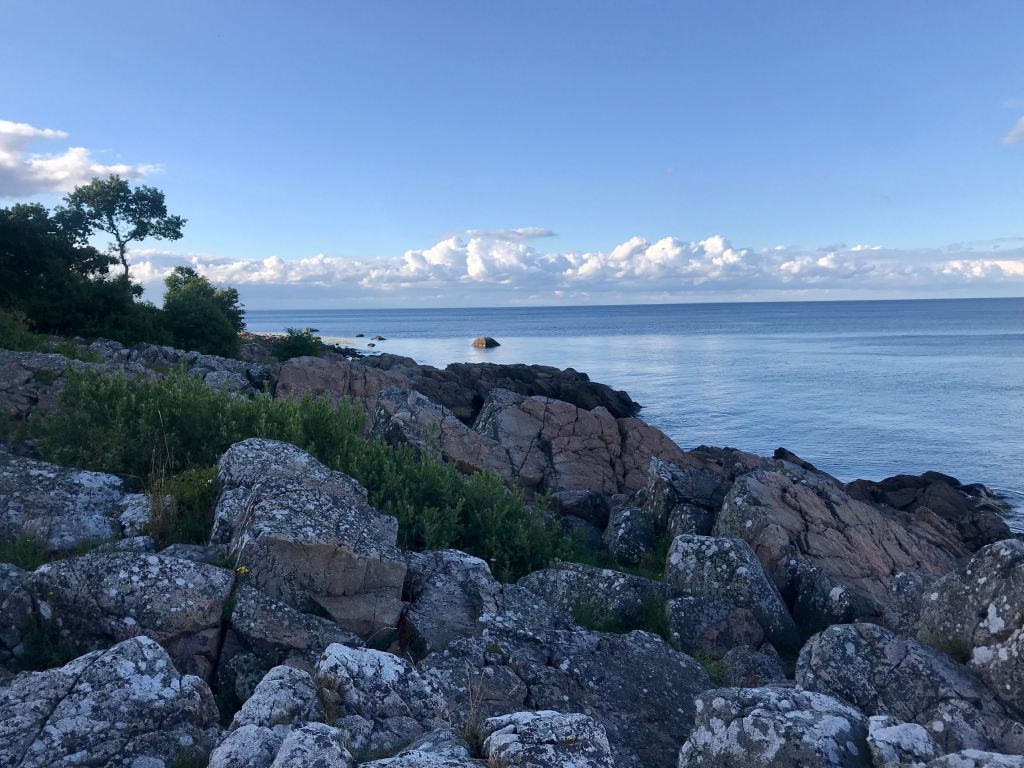 Rambling and camping in Stenshuvud’s National Park from Malmö with a three-year-old was worth the heavy pack. The National Park is wonderful, with fairytale forest trails and a long sandy beach. We took a train and bus connection from Malmo to Södra Mellby and then followed the Google Maps directions for walking into the park. The walk into the park turned out to be challenging and generally awful, with heavy traffic and no place to walk (a first for me in Sweden). Once in the park, however, the stress of the road fell away and we walked from the main entrance to the campground in the Northern section (the park maps are easy to read and very useful). The walk was challenging for a small child–with lots of small rocks to navigate–but entertaining in the varied terrain and glimpses of the sea. As we neared the campground, we walked on calmer, softer ground and through the beautiful forest. The next morning we caught a beautiful sunrise at the lighthouse, which was walking distance from the campground, and ate a breakfast of noodle soup over quickly heating beach stones baked by bright sunshine. On the walk back out of the park, we took a better walking route. We took the first right available from the main road leading out of the park and followed it until it joined the main road (Esperödsliden) here. The road was hilly at times, but provided beautiful views of the ocean and ripe cherries.