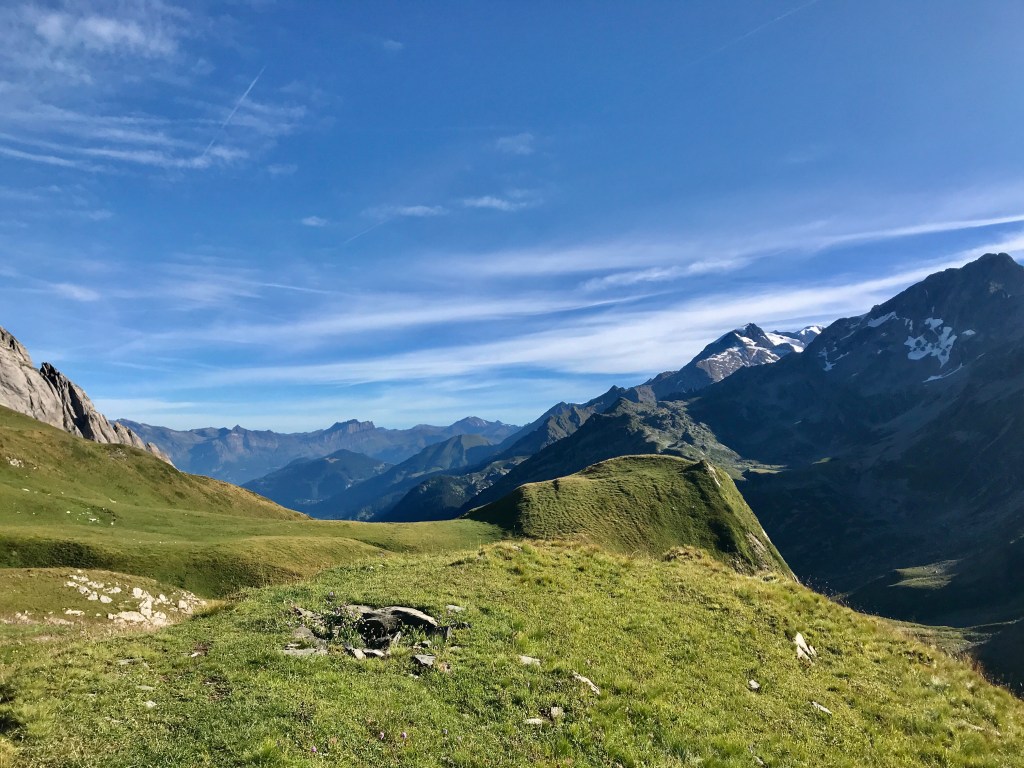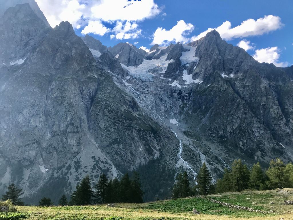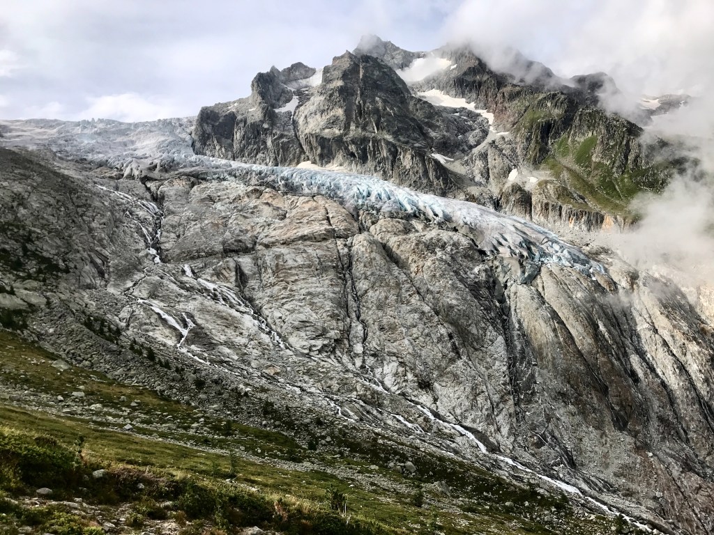 This was one of my favorite days. I left early, along with a few others, while the sky was still cloudy. While it was threatening to rain, which would have made the ascent difficult and dangerous, the weather held and the sun began to burn away the fog. The ascent to the Fênêtre was hard because it required scrambling up large boulders with a massive hiking pack. Without the bag, I think this would have been a relatively easy stage all things considered. The other complication was the challenge of finding the path, and the threat of ending up on the wrong peak, looking down at an impassable descent. Along with a French couple, we were able to navigate to the peak which provided a clear and stunning view of the receding glacier on the right-hand side. Staring down, it was not immediately obvious how one could descend from that height, but the trail ended up being fairly stable (and comparable to some I had experienced in the Dolomites–steep but manageable). Knees screaming, I ended up safe and sound at the Buvette du Glacier du Trient (delicious pies, coffee). After a brief break, I began the ascent to Refuge les Grands (closed due to COVID) and then on to Col de la Balme. I loved this section–the forest provided intermittent shade and I could see the steep mountainside I had just descended across from me. At Refuge les Grands, I had a sandwich and then continued to Col de la Balme. The path required some scrambling and holding on to chains, but for the most part was relatively flat, affording a chance to enjoy the beautiful mountains all around me. At Col de la Balme, I took the shorter descent to Tré-le-Champ, regretting it later since it mostly tracked the ski areas. At La Boerne, I pitched my tent next to the river and joined in a delicious dinner of turkey, pasta, and cheese.