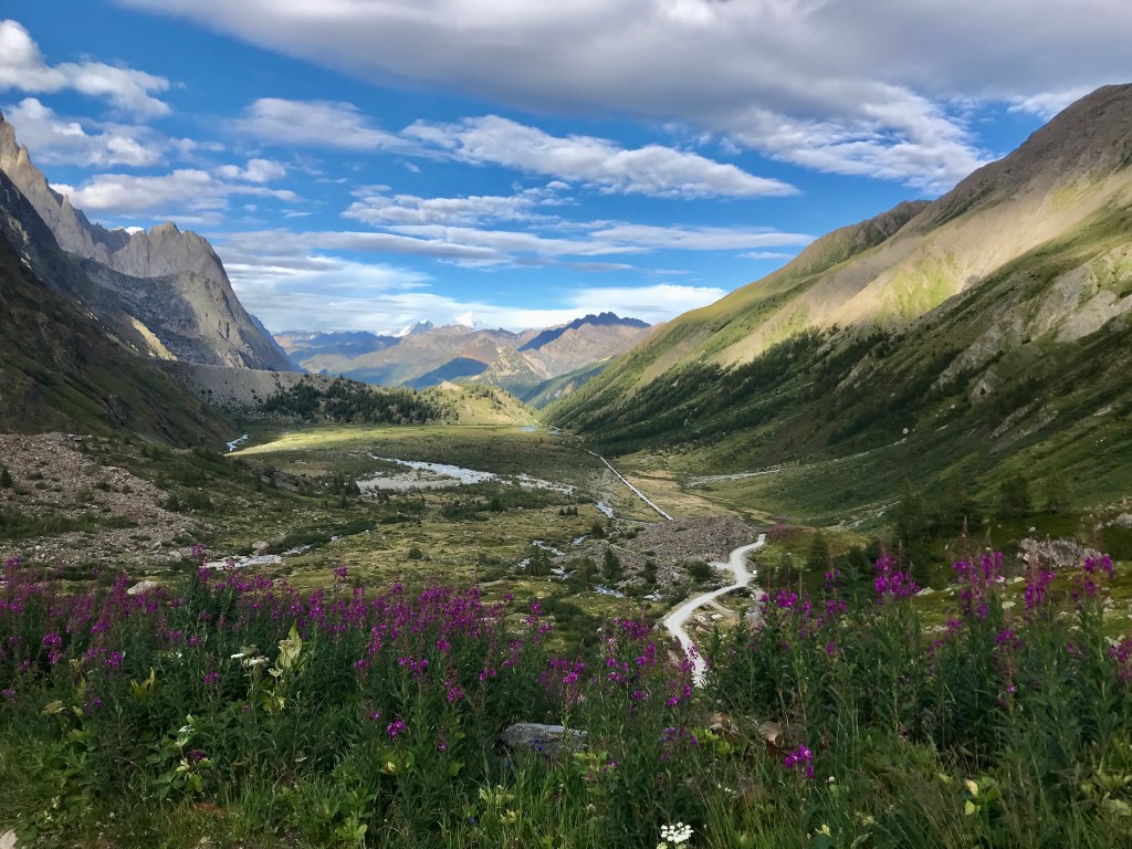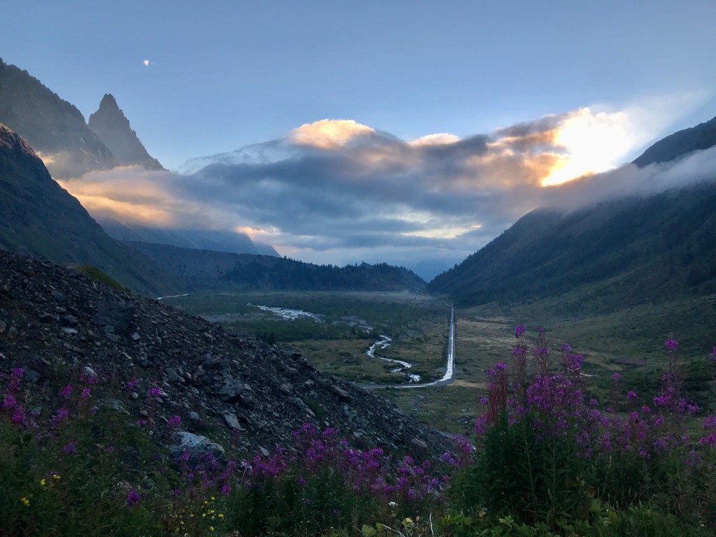 Again, rising early and leaving before 7:30 a.m., I began walking a few hours before the rest of the crowd. This walk was particularly pleasant, in that it began on the side of the mountain with minimal ascent and descent. Eventually, I was dropped–knees aching again–into the valley before the ascent to the Col Ferret. I continued on, assuming I could get a coffee and some warm food at Refugio Elena, which turned out to be closed. After a cold meal of oatmeal-in-a-pouch, I began the ascent to Col Ferret. The remarkable change in geography from Italy to Switzerland was particularly acute here. On the Swiss side, long rolling green mountains began, the chime of cow bells in the distance. I stopped to dry my tent in the warm late morning air and I fell asleep on the side of the hill, among wildflowers and wind. After Col Ferret, a long-ish descent into the first Swiss valley, stopping for lunch at Alpage de la Peule (a place you will appreciate if you love cheese). I took a wrong turn after the Alpage and ended up on the car road to La Fouly, but I eventually refound the trail which wanders down the side of a rushing river. I stopped for a while to read my book and cool my tired feet, arriving at the campground at La Fouly around 3 p.m. (I also made a brief detour to the sports store in La Fouly, which was staffed by absolutely lovely people who helped me assemble my new stove). The campground in La Fouly was busy, formal, expensive, and full of amenities (hot water, wi-fi, coffee, etc.). I pitched my tent next to the rushing river (which, I have now learned, is a guarantee for a good night’s sleep as it crowds out the sound of people putting their tents up after hours). Dusk brought quiet over the campground and the surrounding mountains.