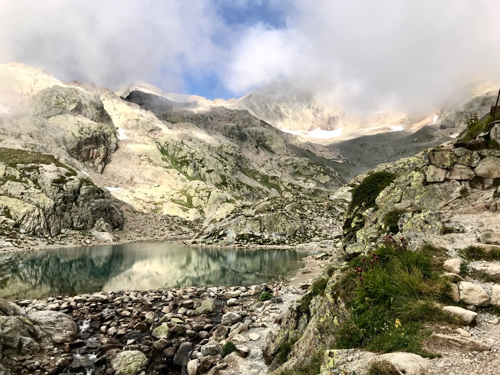 This was an easy walk through small Swiss towns and valleys and finally ascending to Champex-Lac and then on to the Relais d’Arpette. The ascent to Champex was a sudden surprise and strain, but easy compared to prior days. The forests along the way were quiet and shady, a nice break from previous days of heat. It rained a bit, but nothing horrific. In Champex-Lac, I made my way to the bakery Gentiana and stocked up on some goods, while demolishing a quiche and another coffee. I was undecided about what to do next, but finally settled on hiking up to Arpette in case I had the gumption to try the Fênêtre d’Arpette variante in the morning (which was also indicated to be weather dependent). This turned out to be a brilliant decision. The hike up to the Relais was beautiful, following along a small rushing river that provided enough distraction that I was surprised to reach the Relais so quickly. Further, the Relais d’Arpette has a quiet and intimate campsite, which would make this place a wonderful site for a rest day, and delicious, generous dinner. The staff were wonderful. The restaurant manager took one look at my huge heel blisters and fixed them up, leaving me with some medicated cream to apply. The campsite was quiet after dusk, and I slept soundly.