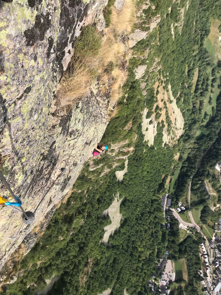 Another via ferrata near Vielha and accessible by bus from there. While less magnificent than the route in Unha, it presented its own challenge. The first section includes an intimidating overhang that benefited from strong upper arms and solid confidence. I ended up spooked before we had even really started to climb the first section, so we descended and began with the second section which was much simpler (leaning towards dull after Unha). After that, we returned to complete the first section and then took the escape route back down to the valley floor. It was beautiful up on the top, but the view slightly marred by a quarry and heavy construction in the valley floor.