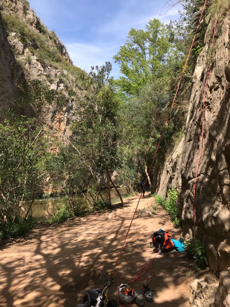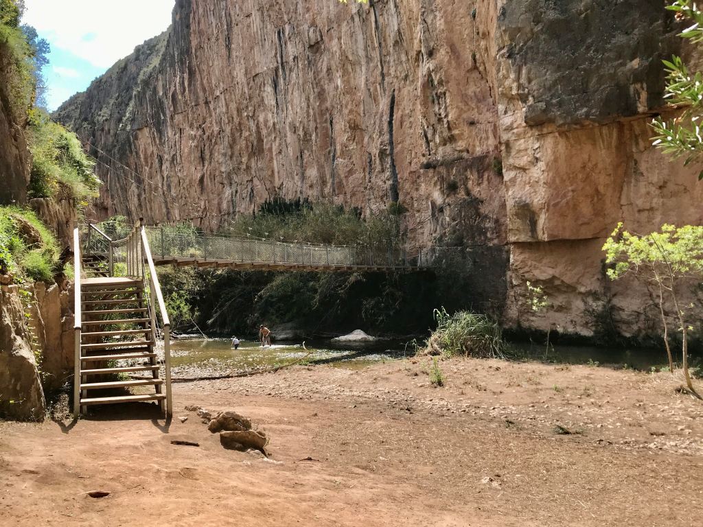 After much trial and error, we managed to find two climbing areas that could accommodate sport climbing beginners and a sometimes frustrated four-year-old. The first, La Ceguera (routes 4-11 on the first image), is just a few minutes down from one of the Chulilla parking lots. The path was a bit hidden due to construction, but, once at the parking lot, head towards the wall edge and you should be able to find a small footpath heading down. Continue past the first wall on the right, which is immediately under the parking lot, to the second, a little further down. The other wall we climbed was just after the suspension bridge at Puentes Colgantes. The climbing area is not showing up on 27crags, but is well-marked, including photos, in climbmaps under the name Miguel Gómez. Also easy to find: it’s the wall on the left side right after the first suspension bridge and before the second bridge when you are walking in from this parking lot.