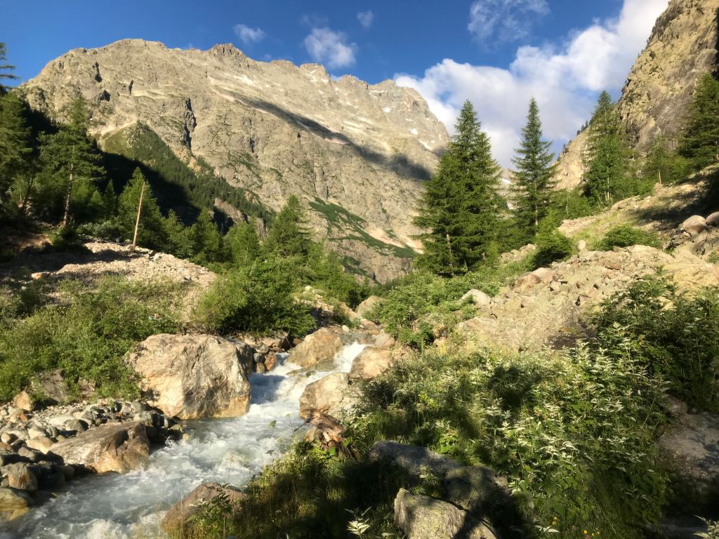 Camping Ailefroide had the additional bonus of being the starting point for a great run towards Refuge du Pelvoux (2704m). I did not run the entire trail because my ‘short’ run days coincided with our time in the park, but the initial kilometres were beautiful. You start with a ‘gentle’ warm-up in the forest (leaving from Camping Ailefroide) with a moderate incline, which then gets increasingly steep. It was a wonderful reminder of the magic of sound in the mountains. One step and the world is silent; the next, you are surrounded by the incessant, rough sounds of a waterfall.