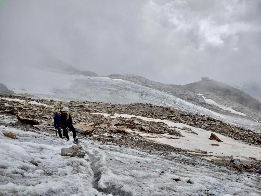 The walk to Refuge Gnifetti from the Indren chairlift was not particularly strenuous. It was relatively easy to navigate with a GPS watch and some light trail markings. It was also quite busy. We roped up a few times when we passed over snow, although we saw a fair amount of people just walking across the glacier snow in crampons without much more. A word of caution: there are a few ladders right before the refuge that cannot be avoided. There is also another section of ropes and ladders before that which we skipped on the way back down by taking the trail from Refuge Gnifetti to Refuge Mantova and then to the Indren chairlift. I personally find ladders and ropes fun – they break up the monotony of walking. We had pretty grim views the day we hiked up to Refuge Gnifetti, but a splendid sight over the valley on the way down. While not as exciting as walking on the glacier, this is still a beautiful walk and at +3,000 m should not be underestimated (i.e. take your time) if you’re not adjusted to altitude.