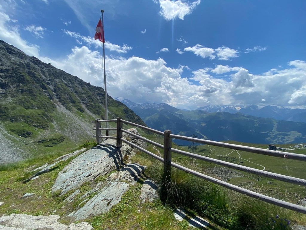 We left the Relais d’Arpette camping with the sunrise and stumbled down to the bakery in Champex-Lac, which was just opening at 6:30 am. A decaf and slice of pie (the first of many, many delicious Swiss pies) and we were on our way. This was mostly a valley day, with significant descent as we picked our way from Champex-Lax (1466m) to Le Châble (821m). The morning presented some beautiful green hills, but the afternoon section between Sembrancher and Le Châble left us a bit uninspired (and perhaps something to skip if you are looking for shortcuts!). That said, we did get to see some interesting working farms and took an absentminded detour to a chapel perched on the edge of a mountain. From Le Châble, we unapologetically took a bus to Verbier and, after purchasing much needed new boots, the chair lift to Les Ruinettes (2195m). From there, we had a lunch of bread and cheese—acquired in Le Châble at the small Migros—in a strange cement block, which turned out to be some kind of art installation, and walked the short distance to Cabane Mont Fort (2457m). We were greeted with wonderful Swiss hospitality and two completely empty dorm rooms. The Cabane is around some of the ski-scarred areas, but it is still beautiful. The mountains around it were alive with the piercing whistles of marmots, and eventually with the explosion of thunder and lightning that we had decided to shelter against towards the middle of the night.