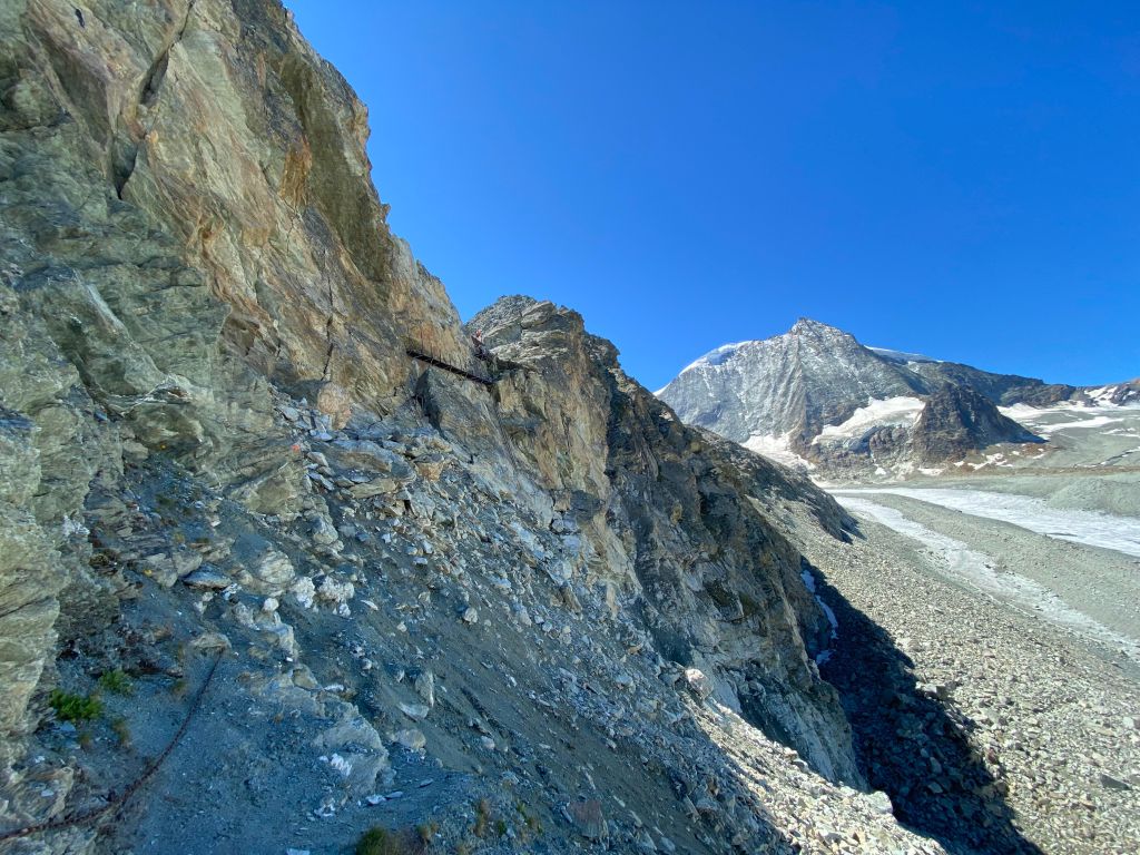 After a peaceful night wild camping above Jungu/Jungen, we walked down to the lift and had a quick coffee and croissant. After that, we took the Jungu lift down to St. Niklas. This wasn’t your typical big ski lift which scars the entire hillside but rather a tiny flying box on a little cable…it was interesting. We saw the mountainside from a whole new perspective, including gigantic tumbling rivers and waterfalls, and the remnants of violent avalanches and rock slides. We visited the grocery store in town and then hiked up to Gasenreid to start the apparently famous Europaweg. We were pretty disappointed by the first five hours on that trail (indeed, I would recommend skipping this segment and starting it at Randa instead), until we were again at an altitude of 2000m or so. There were some uninspiring ups and downs (done to re-route around rock falls, but which basically take you to the valley bottom and back up several times) that were both brutal and without the reward of a view. Things started to look up closer to the Europahütte where we eventually crashed for the night.
