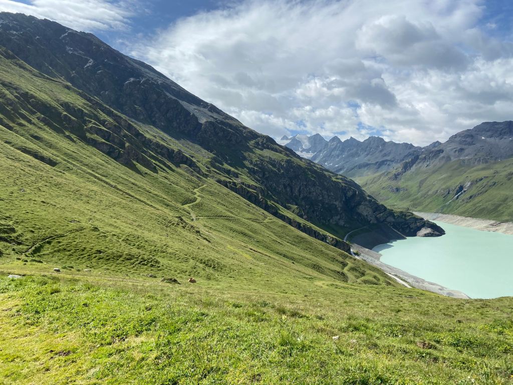 After Col de la Chaux we passed over Col de Louvie (2921m) and Col de Prafleuri (2987m) before making it down to Cabane de Prafleuri (2624m). The Cabane wasn’t quite open for the season yet but we found a few snacks and then continued on to Refuge Barmaz (2458m). To our surprise, there was a warden from the gymnastic society (which owns the building) taking care of the property as part of her vacation and she was joined by her friends in the evening. Reflecting even more kind Swiss hospitality (and a cultural exchange as they were eager to learn more about Quebec), we were generously treated to fondue, vin blanc, and a breakfast of tartines with coffee. The Refuge is perched above the gigantic Lac des Dix in an utterly peaceful corner of the mountain. After eating and drinking, we slept through a quiet, cold night with little wind. Indeed, a day of contrasts, from the Grand désert left in the wake of the glaciers vanishing before our eyes, to green hillsides dotted with waterfalls, sunshine, and marmots calling. This was perhaps the most special day of them all.