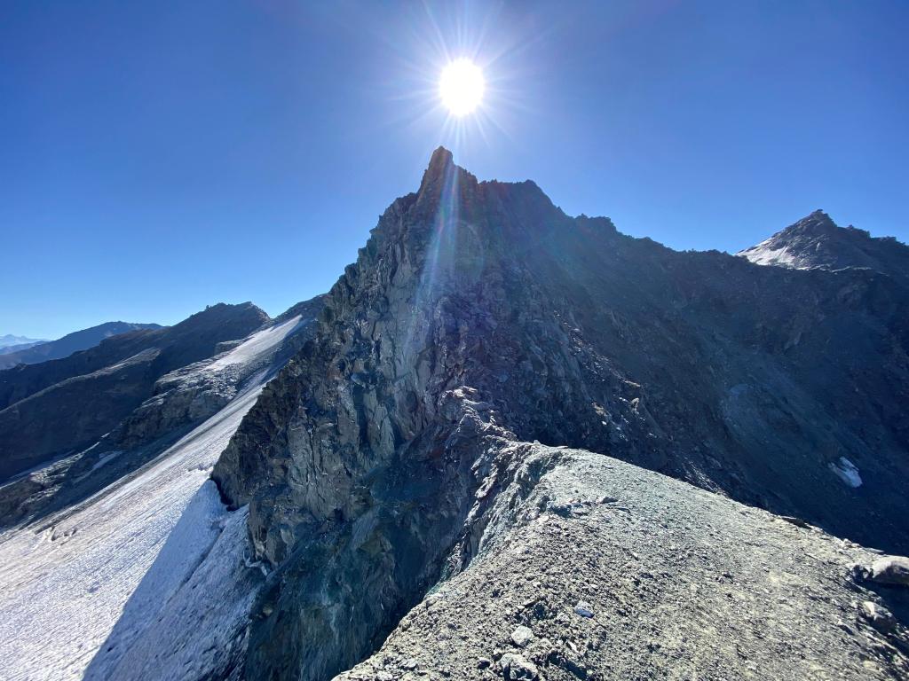 At the ridge, things get quite dicey. This is not a trail for those with vertigo or without any exposure rock climbing or dealing with very exposed trails. At the ridge, we also lost the trail (the trail markings on GPS tracks and Swisstopo were no longer correct) so followed some Swiss trail runners who were not at all afraid of heights. We ended up going down on the glacier for about 2-3 meters and then going back up to the rocks where we rejoined the trail. The ridge is basically what you would expect: a nail-biting scramble up and down big blocks and rocks, hoping that none of them pop out of the wall and that you have not irretrievably lost the trail (there are some markings, but not much). There was one piece of equipment the whole way, available for a half-hearted rappel. There were places to throw up slings if you wanted to be more secure. I am still in disbelief how the trail runners were completely unfazed by exposure.
